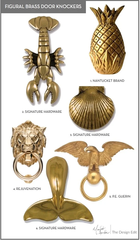 1. Pineapple knocker, $159, Nantucket Brand. 2. Lobster knocker, $140, Signature Hardware. 3. Scallop shell knocker, $130, Signature Hardware. 4. Lion head knocker, $159, Rejuvenation. 5. Eagle knocker, (price upon request), P.E. Guerin. 6. Whale's Tail knocker, $130, Signature Hardware.