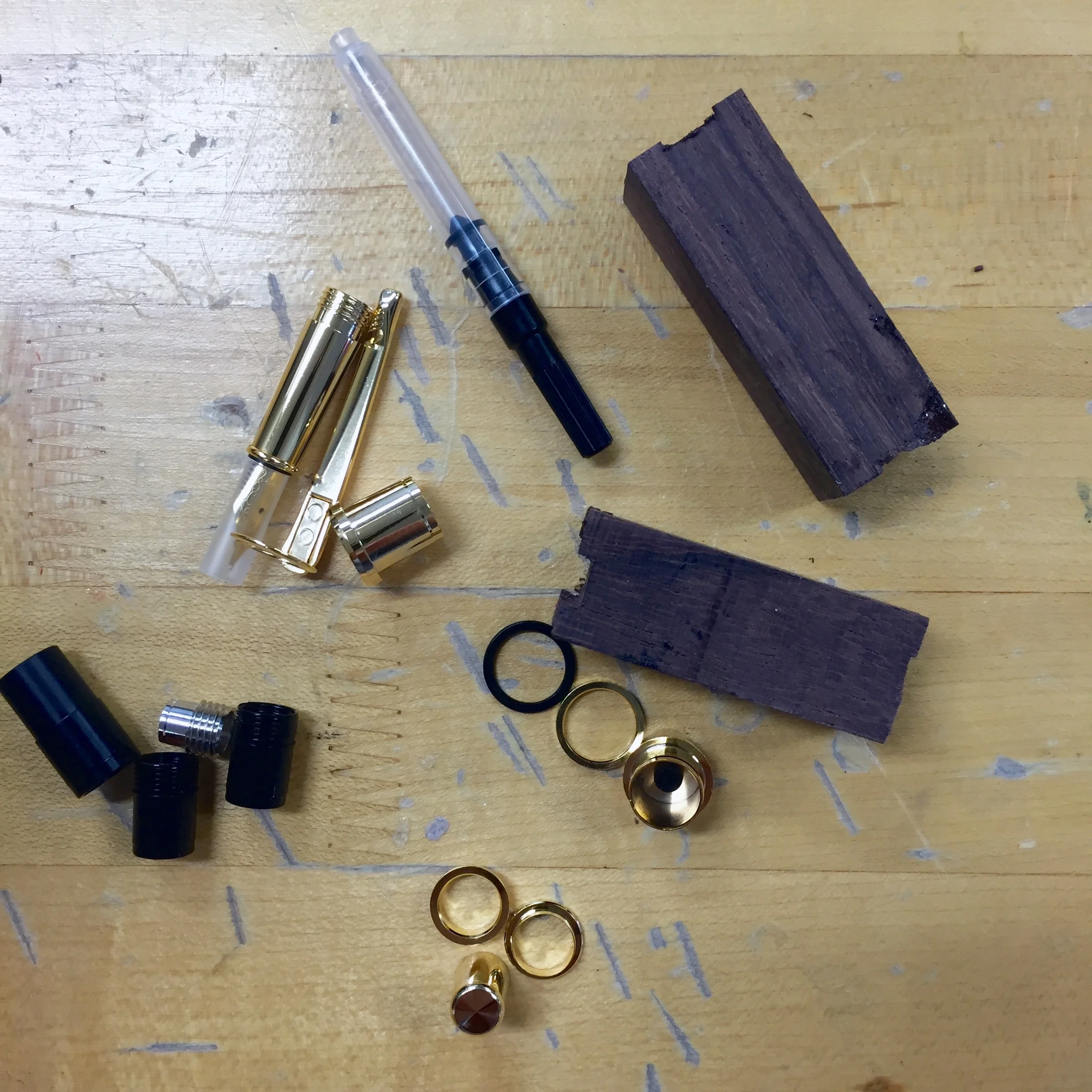 1. Gather all materials. Wood pieces already fitted with tubes plus fountain pen hardware. Lee Valley has pen hardware in many styles.
