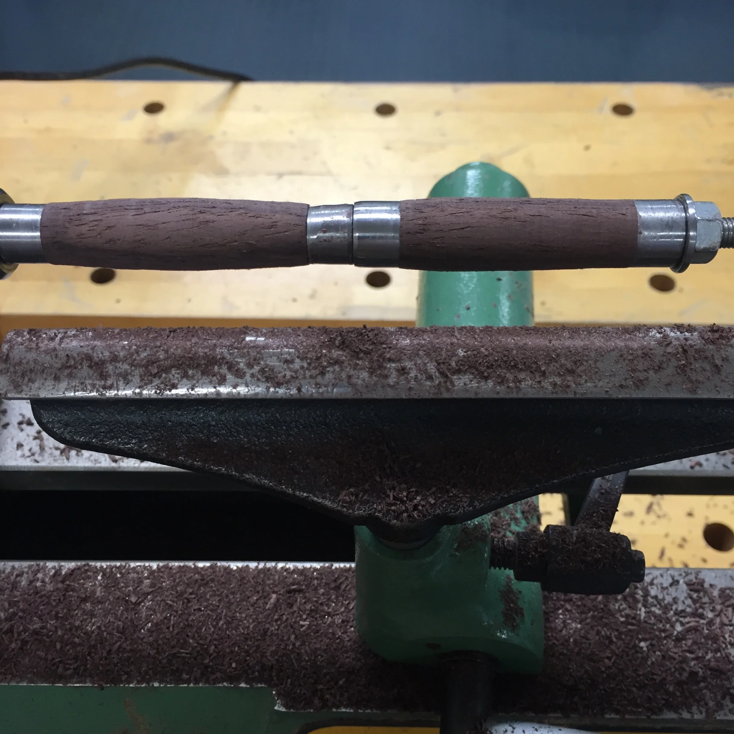 4. Switch to the large spindle gouge to refine the pieces to the desired shape and to ensure that each end is flush with the bushing. I went with a slightly ellipse form (which truthfully I kind of regret — wish I had made it slim, straight and simple. No matter, I will just sign up for a seminar and make another!)