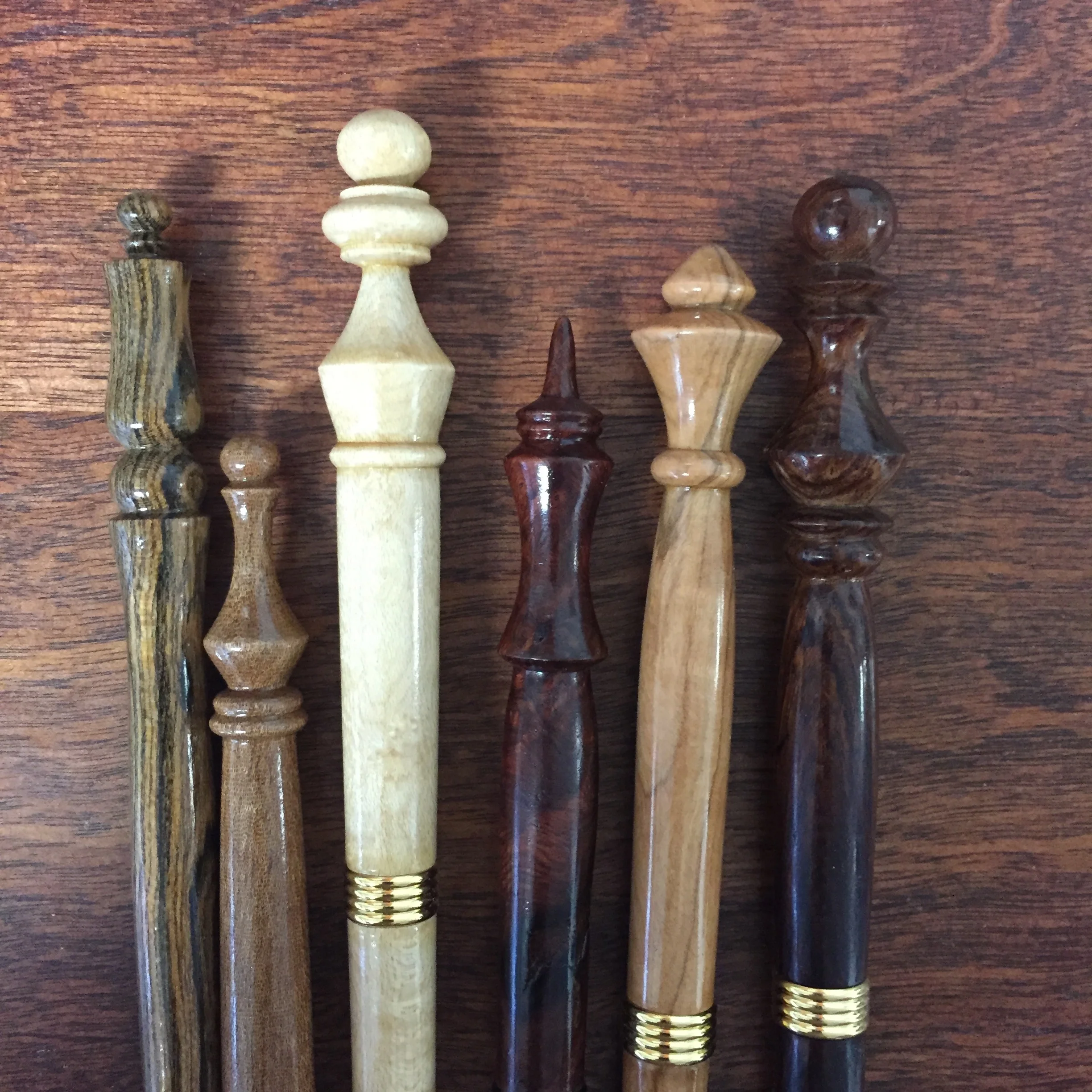 And now as promised an introduction to the work of our instructor Amanda Blacoe of Mercure Pens. To say she is a master of the lathe would not be an exaggeration. She makes these lovely creations with finial ends that she presses into double-duty as hair sticks. So. Gorgeous.