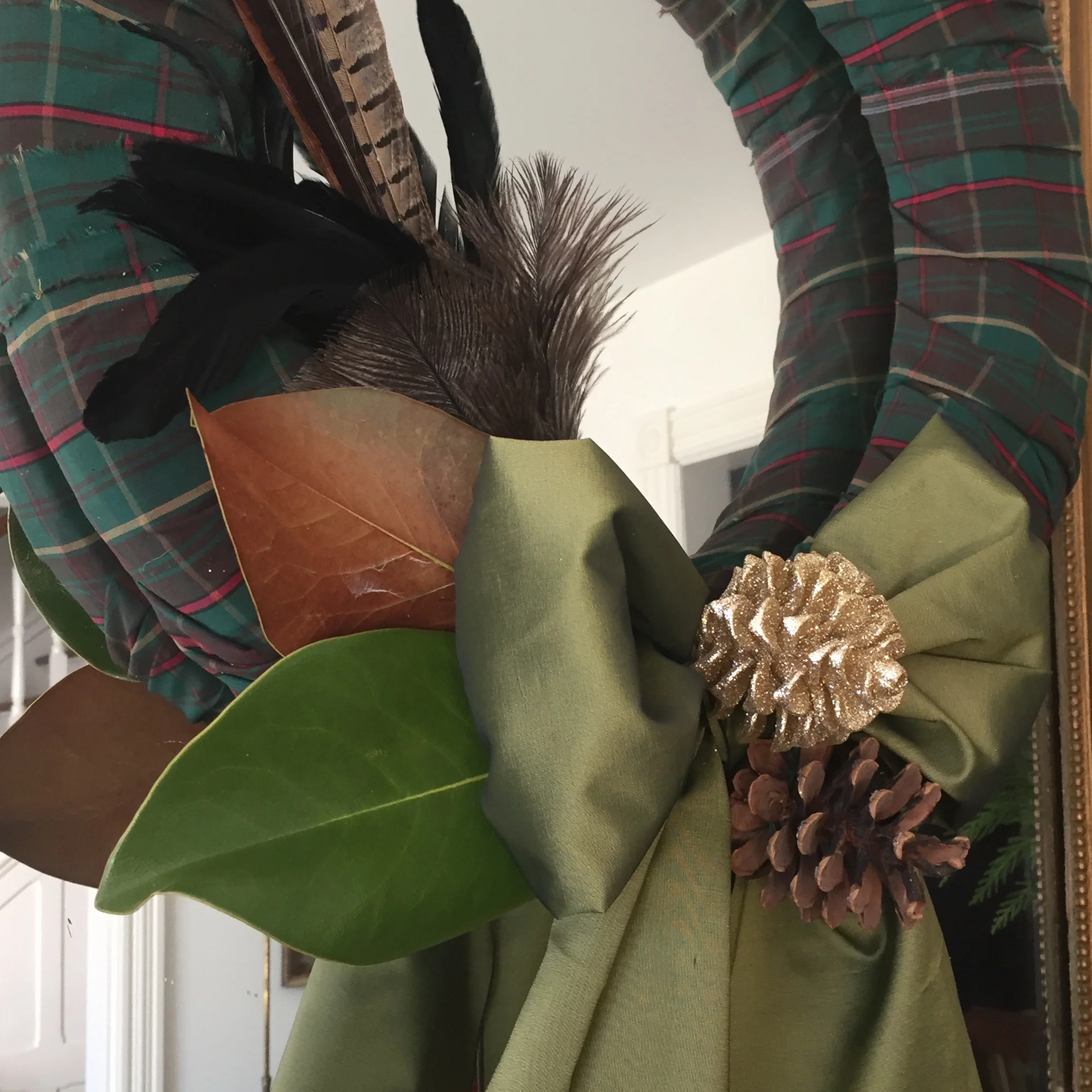 I decided to add one gold pinecone ornament and one real pinecone because two gold ones was just too much sparkle for my taste (too sweet). I tied them on with twine. A die-hard DIYer would have had a million diff types of wire on hand to do the job, but whatever. Twine works. The leaves and feathers are just poked into place through the layers of fabric.