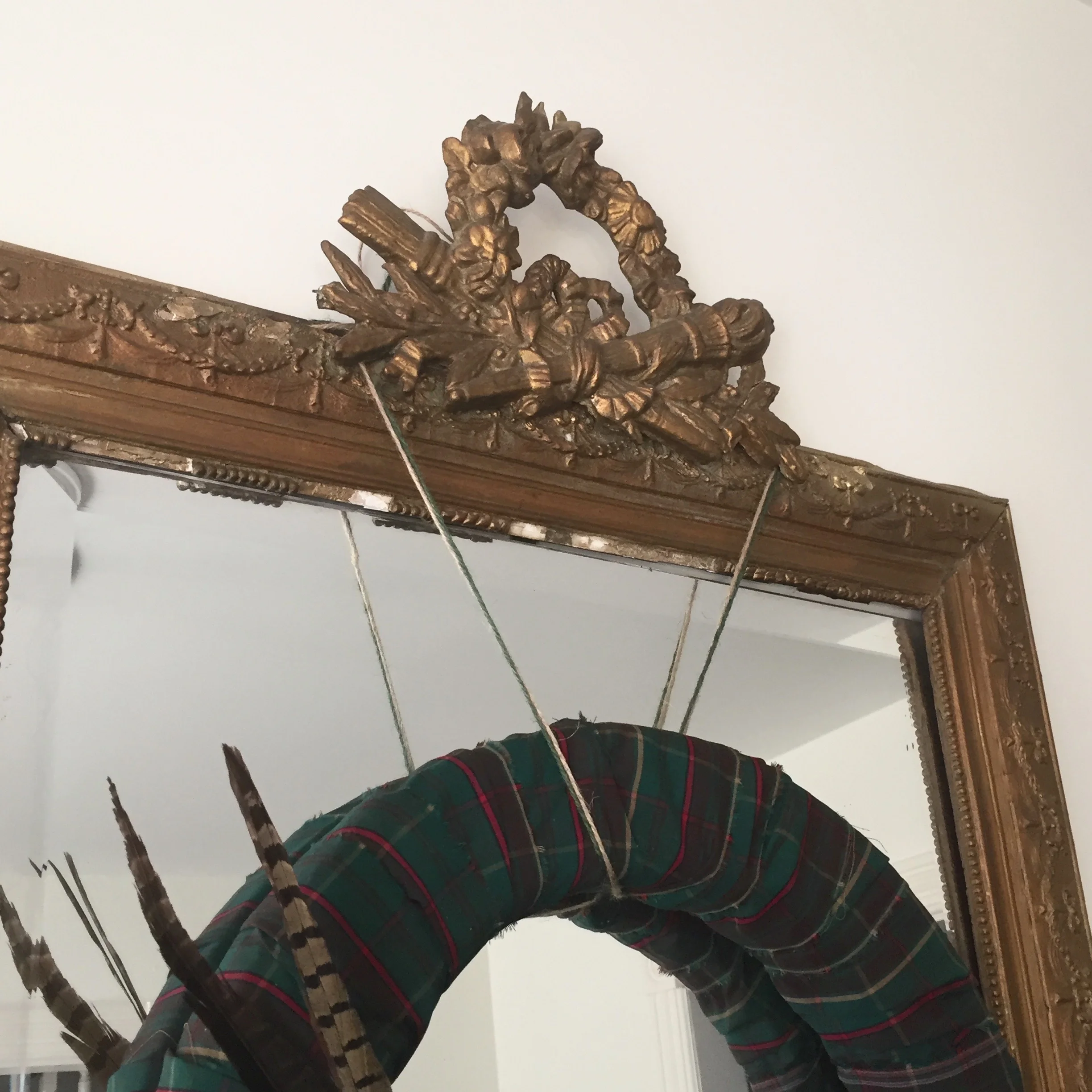I designed this wreath specifically to hang on this mirror. Wreaths on mirrors is a favourite Holiday decorating idea, but sometimes they can be quite heavy and one worries about both the wreath and the mirror. This wreath is mostly styrofoam so light as, well, a feather (or two), so it's great for hanging on a mirror. I used two tones of jute twine and hung the light wreath from the top carving detail on the wreath.