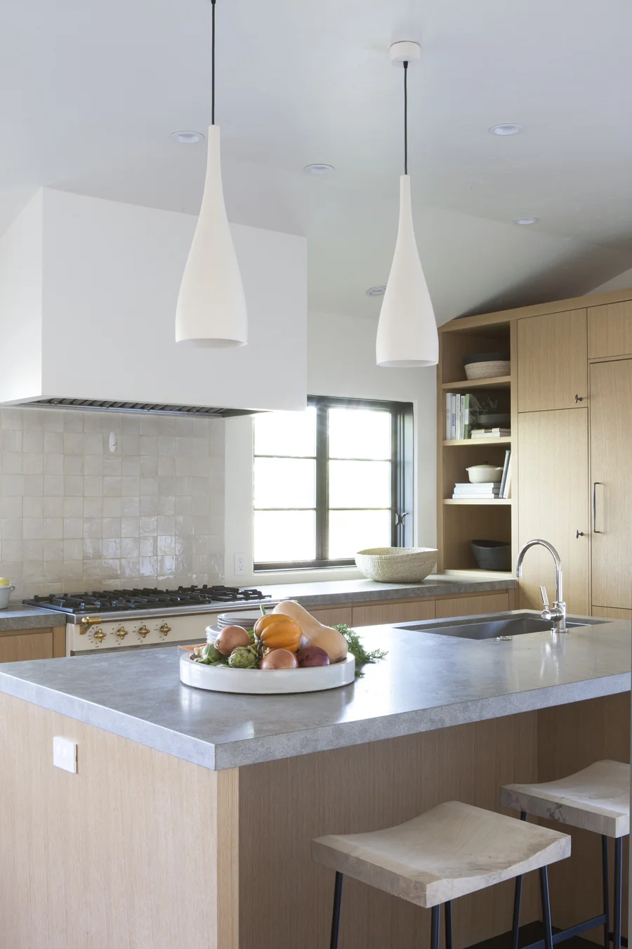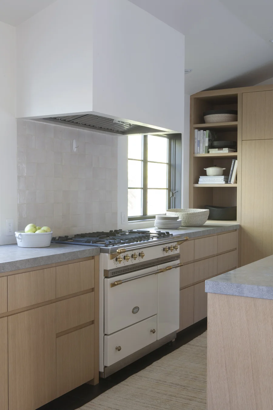 The kitchen is so minimal yet so packed full of details to note. The disappearing range hood is a trend gesture that helps reach the end goal of visual quietude. The mix of finishes is a delight — very understated use of creamy handmade tiles alongside concrete counters and blonde wood cabinets result in a gentle harmony of tones. Nothing too stark, no high shine or high contrast.